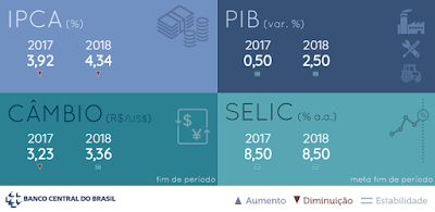 A projeção para a inflação este ano está abaixo do centro da meta que é 4,5%. A meta tem ainda limite inferior de 3% e superior de 6%. Para 2018, a estimativa foi reduzida de 4,32% para 4,30%, no quarto ajuste seguido.